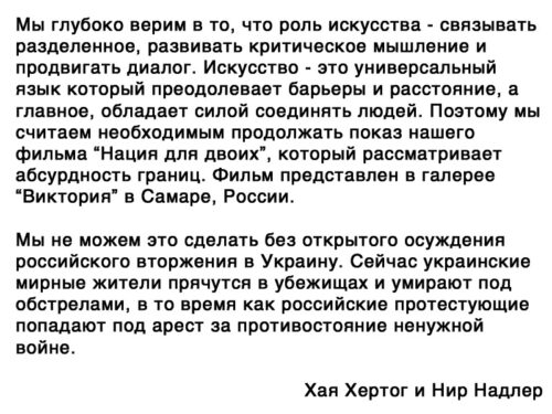 We strongly believe in the role the arts can play in bridging divides, developing critical thinking and promoting dialogue. Art is a universal language that can overcome barriers and distance and has the power to connect people. Therefore we find it important to keep on showing our film ‘Nation for two’, which addresses the absurdity of borders, at gallery Victoria in Samara, Russia.