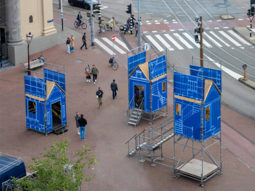 Ushpizin is a public installation that revives the tradition of building temporary shelters symbolizing life’s fragility and honoring Jewish heritage. Using blueprints of post-WWII houses, the installation reflects on history and resilience.